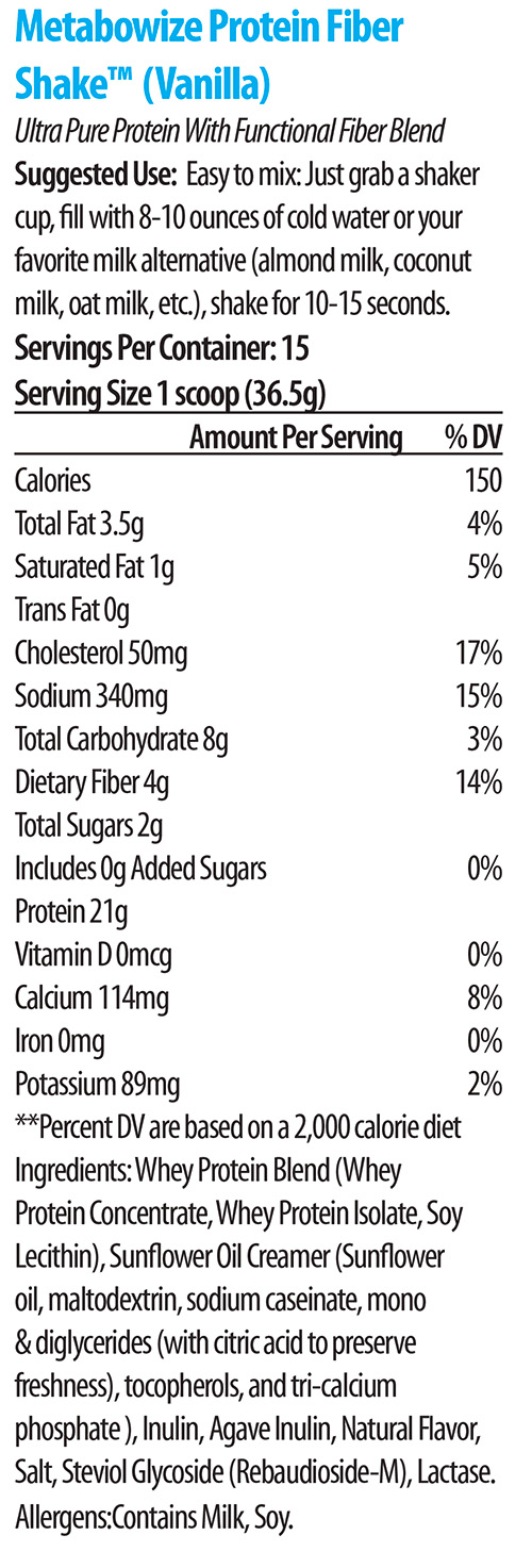 MetaboWize Shake is a proprietary, naturally sweetened protein fiber formulation consisting of cold processed, cross-flow microfiltered whey protein isolates and concentrates (derived from hormone-free and antibiotic-free cattle) along with a specialized prebiotic and probiotic fiber blend.